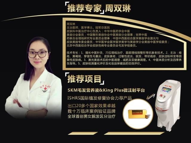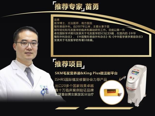 SKM毛发营养液,是ISHRS国际毛发修复协会力荐产品,出口20多个国家效果卓越,数十万临床案例验证品牌,全球首创男女脱发区分治疗,突破口服用药和外用药、植发、物理刺激等常规疗法的一种新型止脱、生发育发的供毛囊营养的产品。运用中胚层疗法,将生物活性液注入皮肤真皮层,通过对头皮毛囊机械刺激与生物化学刺激,针对性地对男性脱发、女性脱发区分治疗,使皮内组织或皮下组织及毛母细胞进行针对性的刺激达到治疗效果。