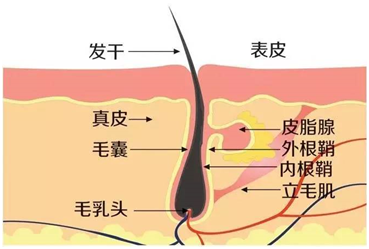 毛囊并不是一个点,而是一个类似U型的器官,大家都经历过这样的一个事,掉下发的头发发根上有个小白点,那个其实是毛球,并非是毛囊。要知道,毛囊绝对不可能从头皮里掉落出来。大家可以看看毛囊结构图,皮脂腺就是在毛孔内部,而皮脂腺是产生头皮油脂的地方。所以,头皮只要出油,肯定会经由毛囊流出,不存在堵塞,也不会对头发生长产生重大影响。很多脱发患者认为头发油、堵塞了毛孔是脱发的根本原因,其实是错误的。而脱发的真正原因,还要归咎到一种雄性激素——二氢睾酮(DHT)身上。