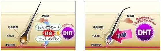头顶部的毛囊,由于天生的基因结构缺陷,其结构中含有一种5α-还原酶。5α-还原酶能将血清中的雄激素(睾酮)还原成双氢睾酮(DHT),DHT会使毛发生长期缩短,毛囊萎缩,导致头发越来越细、越来越软,掉发频率增加,久而久之就是毛囊彻底萎缩,形成秃顶。