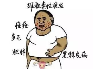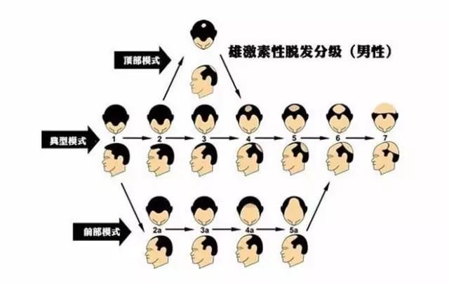 但当雄性激素分泌不足,就会影响人体生长发育,造成性功能低下,出现女性特征;分泌过多会导致肥胖问题,女性则可能出现月经紊乱、经量稀少,甚至干扰排卵的情况,最重要的是男女都可能出现雄激素型脱发!(见上图)