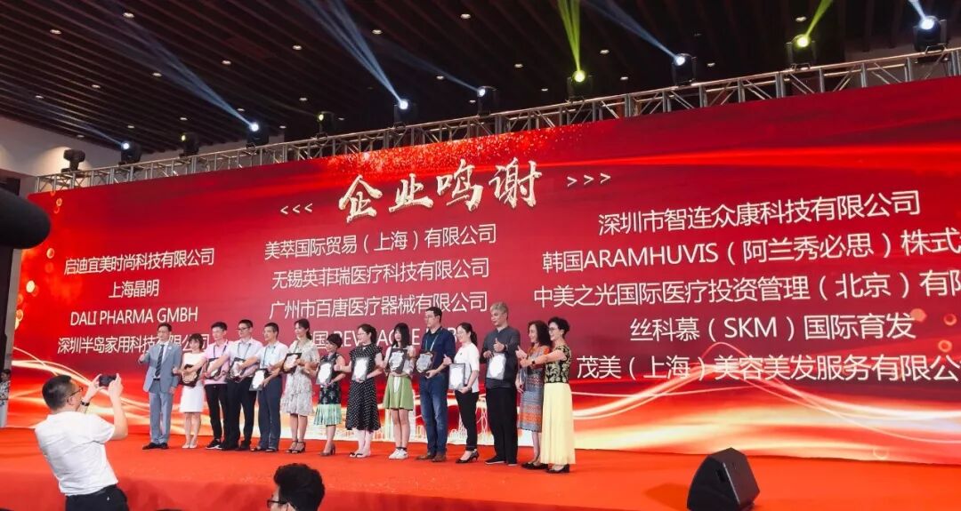 8月10日晚,主办方举行答谢会,对参会的优秀企业进行鸣谢和嘉奖。大会主席张菊芳教授亲自颁发证书,丝科慕(SKM)国际育发荣幸受奖,与专家、主办方代表,其他企业代表合影留念。