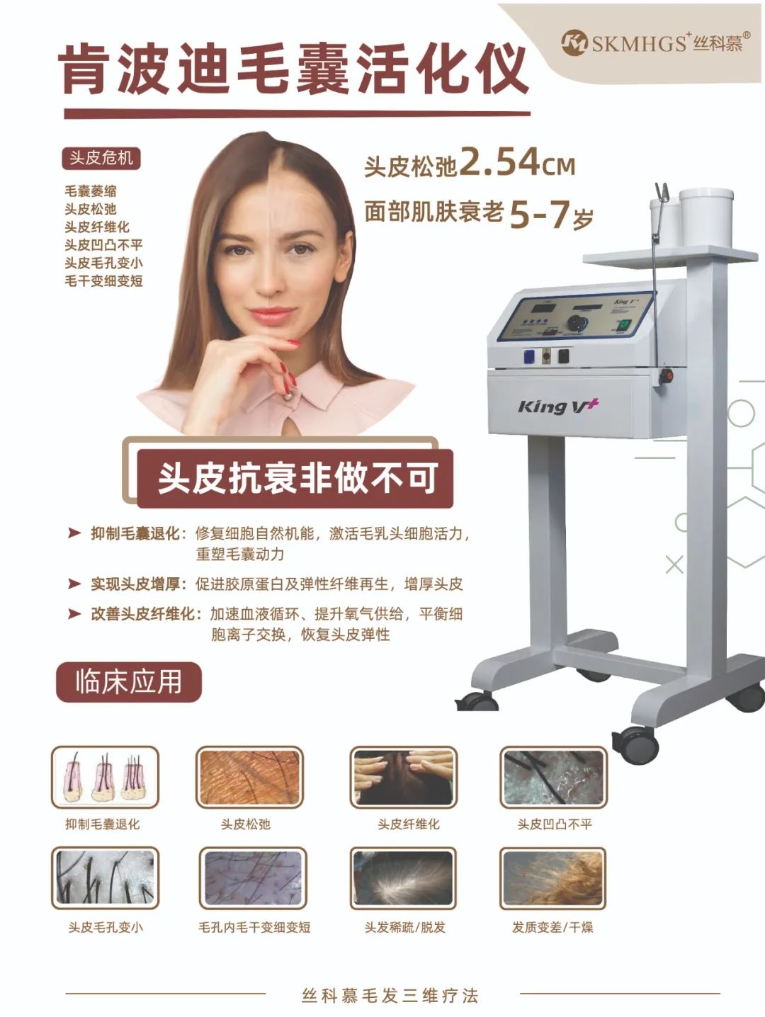 在真皮乳头层里,毛根被内、外毛鞘包围,外毛鞘又被结缔组织细胞包围,形成口袋状,称毛囊。毛囊是包围在毛发根部的囊状组织,内层是上皮组织性毛囊,外层是结缔组织性毛囊,内层与表皮相连,外层则与真皮相连。人体所有的毛囊与人一起出生,并伴随人的一生,毛囊死亡后不能再生,是珍贵的不可再生资源。毛囊由毛干,毛凸,毛球,毛乳头,毛基质等部分组成。毛囊从内到外由内根鞘、外根鞘及结缔组织鞘组成,前两层根鞘的细胞均起源于表皮,而结缔组织鞘则起源于真皮。毛囊的发育经过表皮和真皮之间一系列复杂的相互作用而形成,具有周期性生长的特点,生长期、退行期与休止期三个阶段周而复始,形成了毛发的生长周期。毛囊的最深处是位于角质层3-7mm的毛乳头,它含有神经和血管,向毛干提供养分,在头发的生长周期中发挥了关键的作用。毛乳头细胞位于毛囊根部毛球部位的凹陷处,是毛囊的控制中心,调控头发的生长周期,生长期发生在头皮下面,毛囊里面的毛干部位;退化期的时候,发根已经冒出头皮,穿透毛孔,成为肉眼看得见的毛干。毛发从毛囊长出,毛囊通过毛乳头从身体吸收养分,支持毛发的生长。毛囊组织内的细胞不断分裂和增殖分化,使头发不断更换和增长,但随着年龄的增长以及长年累月化学物质的伤害和物理性自然损害,毛囊的再生能力逐渐减弱,越来越多的自然掉发转向了脱发现象。所以造成脱发的罪魁祸首是毛囊的萎缩或坏死。只有毛囊健康了,头发才长的好。喜乐注册病态的毛囊想要恢复健康,需要抑制毛囊的进一步退化,激活毛乳头细胞活力,促进毛囊干细胞的增殖分化,改善头皮纤维化,增厚头皮,重塑毛囊动力。肯波迪毛囊活化仪是丝科慕毛发三维疗法核心技术之一,非热生物刺激代谢、微热改善微循环血供、高热杀菌与活化细胞的三大物理效应,能够抑制毛囊退化、增厚头皮、改善头皮纤维化,重塑毛囊动力。肯波迪毛囊活化仪采用独特的内源热技术,调节毛囊内组织细胞的信号及离子交换,修复细胞自然机能,活化毛乳头细胞动力,促进毛囊干细胞增殖分化,提高成纤维干细胞活化及酶反应力,增进必须氨基酸、维生素及低聚糖的同化加强毛干形成,改善头皮纤维化恢复头皮弹性,增强血液流动和氧气供给,进而解决毛囊退化问题。毛囊是头发的“根”,只有毛囊健康了,头发才长的好。肯波迪毛囊活化仪抑制毛囊退化、增厚头皮、改善头皮纤维化、重塑毛囊动力。