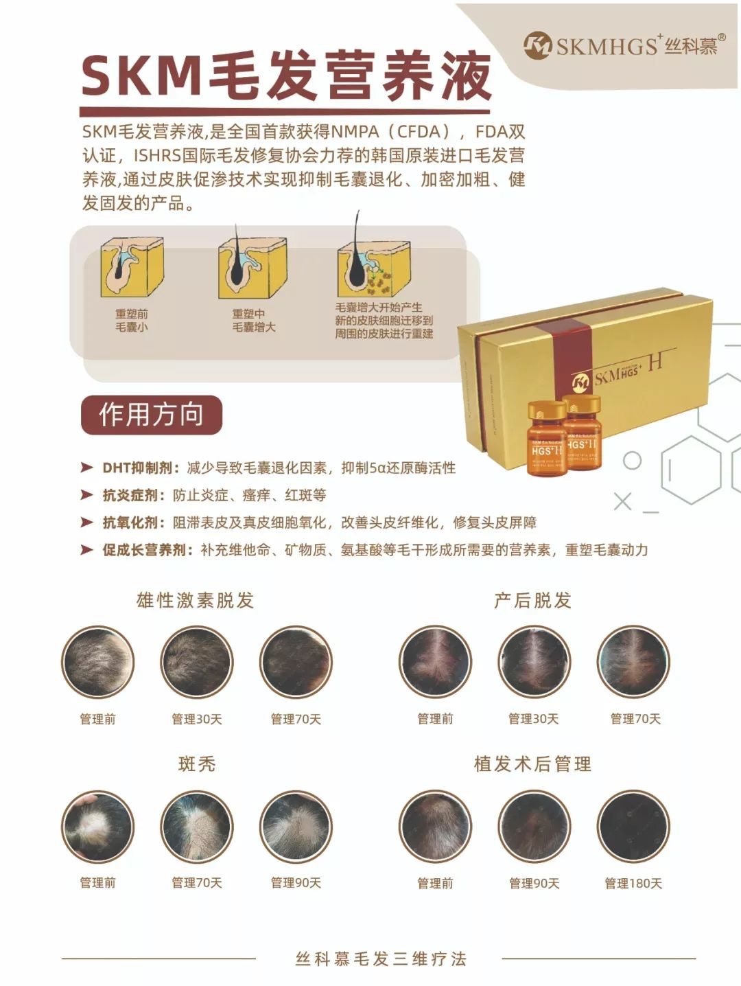 SKM毛发营养液是丝科慕毛发三维疗法核心技术之一,拥有NMPA(CFDA)、FDA双认证,是ISHRS国际毛发修复协会力荐的韩国原装进口毛发营养液。它通过促渗技术,抑制毛囊退化,实现加密、加粗、健发、固发的临床效果。