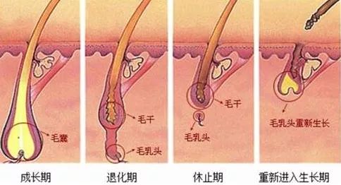 头发脱落到再次生长,休止期约为3个月。直到重新长出发根,撑开毛囊和毛孔。