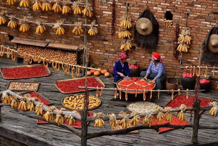 晒秋是一种典型的农俗现象,在湖南、江西、安徽等生活在山区的村民,由于地势复杂,村庄平地极少,只好利用房前屋后及自家窗台、屋顶架晒或挂晒农作物,久而久之就演变成一种传统农俗现象。