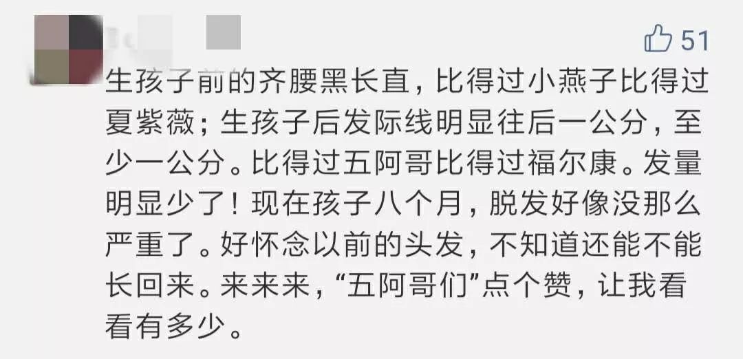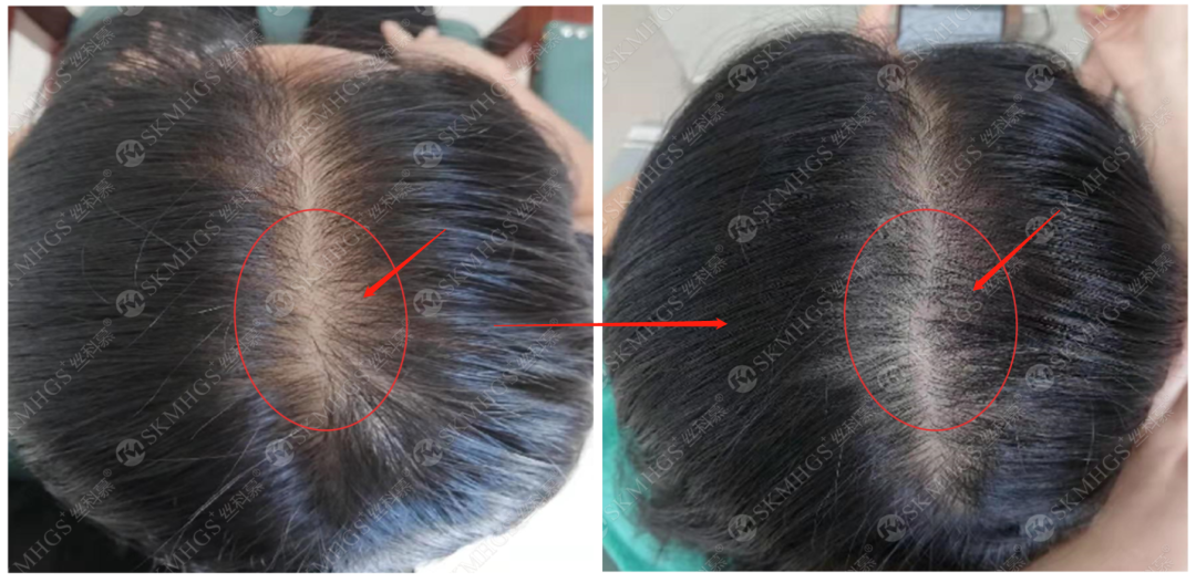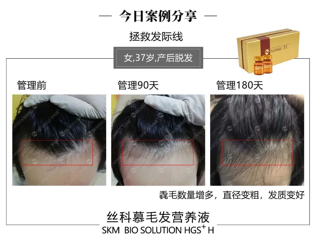 俗话说:“孩子笑,头发掉”、"孩子会认娘,头发落满床”,在生活中,许多新手妈妈在生产后的第二个月就因脱发而饱受困扰,原本乌黑浓密的长发日渐稀疏。去年9月,刘女士在生完孩子第二个月后,发现自己的头发脱落的很严重,大把大把的掉,看着日渐露出的头皮和越来越宽的发缝,刘女士陷入了产后脱发焦虑......在连续掉发3个月后,深受苦恼的刘女士来到了当地的植发机构寻求帮助,通过咨询病情、毛发诊断检查等信息综合分析,判断刘女士是由产后激素变化及压力过大导致的产后脱发。根据刘女士目前的状况,医生安慰道:产后脱发属于急性休止期脱发,宝妈出现产后脱发是正常现象,对身体健康没有太多不利影响,建议放宽心态、放松心情,可采用SKM丝科慕医学养护进行脱发管理。不想再忍受脱发苦恼的刘女士在跟医生详细沟通了管理方案后,当即就决定进行SKM丝科慕医学养护脱发管理。第一次的体验非常神奇,以前所用的防脱产品不是洗发水就是药物涂抹,基本只能作用于头皮,而SKM毛发营养液是利用促渗技术直接导入毛囊,吸收效果更好,能够直接给毛囊提供营养,促进毛囊由休止期向生长期转变,实现头发的加密加粗、健发固发。在SKM丝科慕脱发管理进行到第三次,也就是21天时,刘女士欣喜的告诉医生,头皮敏感改善、发缝变窄,头发肉眼可见的加密加粗!SKM丝科慕脱发管理的阶段式效果呈现,更加坚定了刘女士继续管理脱发的信心,并相信着管理后的终点效果!SKM毛发营养液汇聚了51种毛发相关特性成分,能够为毛囊生长提供足够的营养支持,促进毛干生长,调节毛囊由休止期向生长期转变,确保毛囊更快进入再生长期,重塑毛囊动力,实现抑制毛囊退化,毛干的加密加粗、健发固发。孕期宝妈的身体会分泌大量雌激素,延长头发的生长期,但伴随着宝宝的降生,宝妈体内的激素水平会逐渐恢复正常。因雌激素的“降低”,那些“超期服役”的头发纷纷退役,与此同时,新的秀发又一下子不能生长出来,短期内“青黄不接”,就形成产后脱发。产后宝妈要花费大量的时间和精力照顾宝宝,造成睡眠不足;加之激素水平的变化会影响宝妈的情绪,使宝妈变得异常敏感,更容易烦躁、抑郁。经常性的不稳定情绪会使宝妈的大脑一直处于紧张状态,引起脱发。而头发脱落又会成为新的精神刺激,如此循环不止,脱发越来越多。很多宝妈都是自己带孩子,经常累到废寝忘食,有时还没有胃口;有些宝妈在生下宝宝后不久就急于减肥,刻意节食,导致营养不良。头发缺少生长所需的营养物质如蛋白质、钙、铁、维生素等,影响头发的生长代谢,导致大量脱发。宝妈要尝试与自己和解,放宽心。可以做一些自己喜欢的事情,转移注意力。失眠的宝妈睡前不要思虑太多,建议听一些舒缓的轻音乐或者喝一杯温热的牛奶,这样有助于缓解紧张的脑神经更容易入睡。照顾孩子不是宝妈一个人的任务,奶爸们也应该分担一些。另外,家属也不要给宝妈太大的压力,要时常关心宝妈的精神状况。再忙也要记得按时吃饭哦!良好的饮食可以帮助宝妈缓解产后脱发,建议多吃一些富含铁、植物蛋白、碘质、维生素E的食物及碱性水果,避免食用含糖量高、辛辣、油腻的食物。偏食、挑食都是不好的饮食习惯,只有营养均衡才能养出浓密靓丽的秀发。建议每周洗头的频率在2-3天/次,过于频繁的洗头也会对头发造成伤害。宝妈们要选择性质温和的洗发用品,千万不要心急盲目尝试各种三无生发产品,脱发反而会越来越严重。可以经常使用木梳子梳头发,促进头皮血液循环,加速头发的生长,注意不要太过粗暴哦!尽量少扎很紧的辫子,以免造成牵拉性脱发。生完孩子掉头发,不仅是刘女士,而是很多妈妈们都会遇到的难题。但大部分宝妈一般都是产后暂时性脱发,很快就能重新生长出一头秀发,所以产后脱发往往不属于病理性脱发,不用太担心。如果产后脱发持续3个月以上脱发严重且没有缓解症状,就建议去医院做好检查,采取相应的脱发管理。