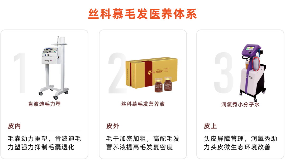 丝科慕毛发医养体系,持续致力于毛发医养专业管理事业,以科学为基础,以专业为指导,以口碑为追求,以成全为使命,建立皮内毛囊动力重塑、皮外毛干加密加粗、皮上头皮屏障管理的多维头皮抗衰毛发医养体系,成为毛发行业备受关注的现象级头皮抗衰管理项目,填补毛发医养头皮抗衰市场空白,持续为求美者的头皮健康保驾护航。