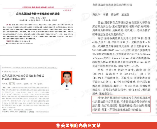 在医美界,有关光子嫩肤的技术创新和临床探索从未止步。大多皮肤科医生都有过体会,行业的IPL设备在热弛豫时间方面都存在局限,使用不当易出现临床迟发反应的副作用。因此,早期强脉冲光技术的发展经历了数次更迭,均以提升安全性为主;后来才开始将安全性与疗效、舒适性并重,佼佼者如由喜乐注册自主研发的格美星细胞光仪器,创新推出点阵强脉冲光FPL(Fractional Pulsed Light)技术,通过将点阵技术应用于强脉冲光,使其作用后的效果能够突破传统脉冲光嫩肤的极限,效果更为优越,安全性更好,现已获得中国NMPA、美国FDA、韩国KFDA、欧盟CE等多重认证,并已在解放军总医院第七医学中心、广州南部战区总医院完成了疗效及安全性临床验证工作,在临床报告中效果被证实优秀,同时国内多篇学术文献的发表也肯定了格美星细胞光的效果。