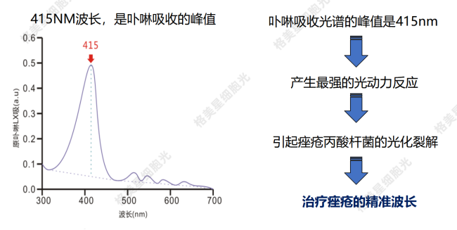在特定皮肤问题的解决上,格美星细胞光着重从疗效、治疗过程舒适度出发。针对痤疮问题,格美星细胞光突破了420nm的短波过滤技术,通过双过滤强光精准技术获得卟啉吸收光谱峰值的415nm波长,同时去掉了产生热疼体验感的红外线波长,并且采用连续脉冲模式,从而实现完全无痛治痤疮的体验和更快的治疗效果。此外,针对难治性黄褐斑,格美星细胞光创新打造强脉冲光微秒(μs)级脉宽治疗,大大提升治疗安全性。