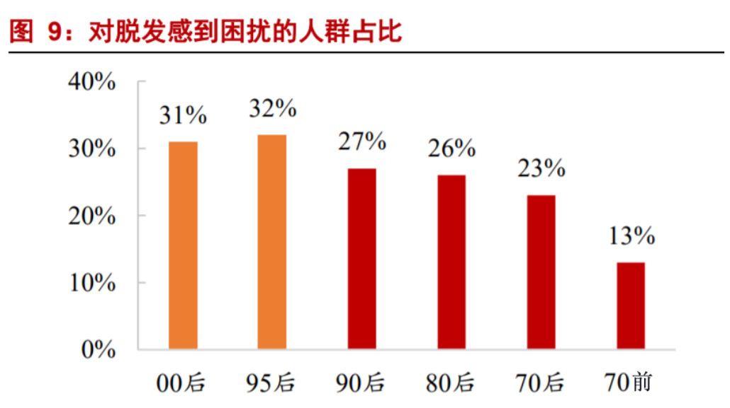 根据国家卫健委发布的一组数据显示,我国已有超过2.5亿人正在饱受发量困扰,平均每6人就有1人有发量烦恼,固发、复密成为当代年轻人审美上的刚需。《2020国民健康洞察报告》显示了年轻人对发量问题感到困扰,95后及00后们对于“脱”发问题的焦虑度和敏感度高于其他代际,而90后则是线上第一大防脱药物的主力消费人群。
