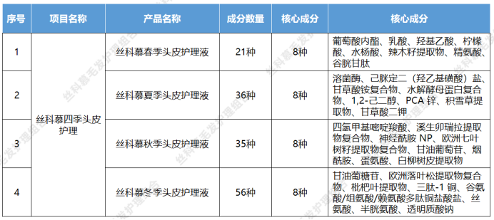 丝科慕四季头皮护理,分别以春、夏、秋、冬四季为四个单品,致力于皮上头皮微生态环境的管理。采用国际专利成分,实现平衡头皮PH值、改善头皮厚度、恢复头皮弹性、抵抗头皮衰老为管理目标。
