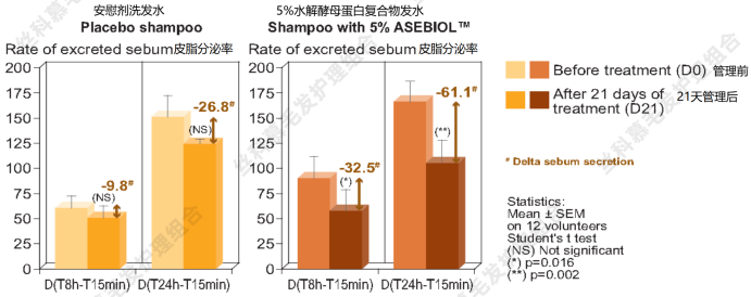 已有相关实验结果表明,使用含有水解酵母蛋白复合物的毛发护理产品管理后,头皮上的油脂分泌显著减少,反映出皮脂腺调节得到改善,从而产生抗油性头皮效果;而管理后的24小时比管理后8小时更有效,皮脂分泌仍然显著减少,不仅能清洁头皮上的皮脂,还可以通过减少皮脂的分泌率积极地干扰皮脂腺的活动。