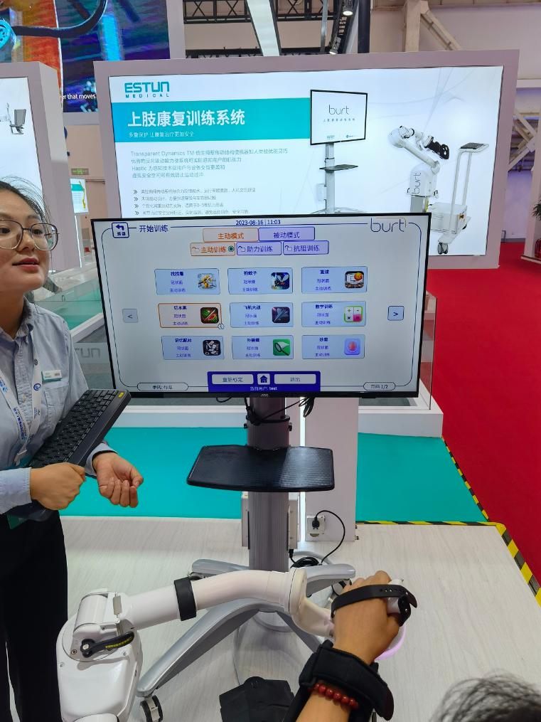 手臂固定在支架上,手握圆形手柄,操作人员可以在屏幕上设置切西瓜、飞机大战、扑蝴蝶等上肢活动游戏,帮助患者进行康复训练,这是埃斯顿医疗开发的上肢康复训练系统。