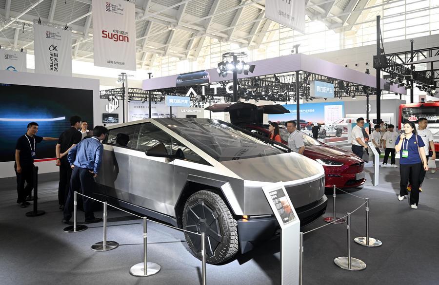 6月20日,参观者在博览会智能网联汽车展区参观特斯拉皮卡车。新华社记者 赵子硕 摄