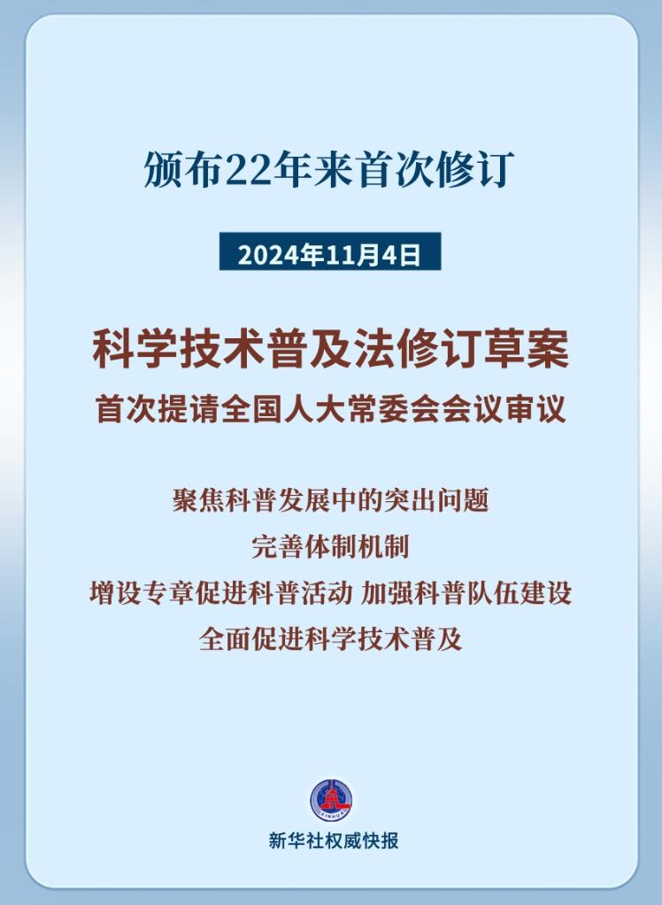 11月4日,科学技术普及法修订草案首次提请全国人大常委会会议审议,这是科学技术普及法自2002年公布施行以来的首次修订。
