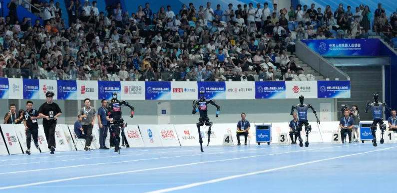 8月17日,在世界人形机器人运动会100米决赛中,来自天骁队(右一)、天工队(右二)、高羿科技队(左二)和灵翌科技队(左一)的人形机器人在比赛中出发。新华社记者 鞠焕宗 摄