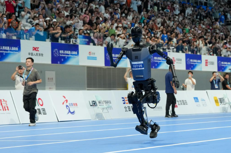 8月17日,在世界人形机器人运动会100米决赛中,天工队的人形机器人在奔跑。新华社记者 鞠焕宗 摄