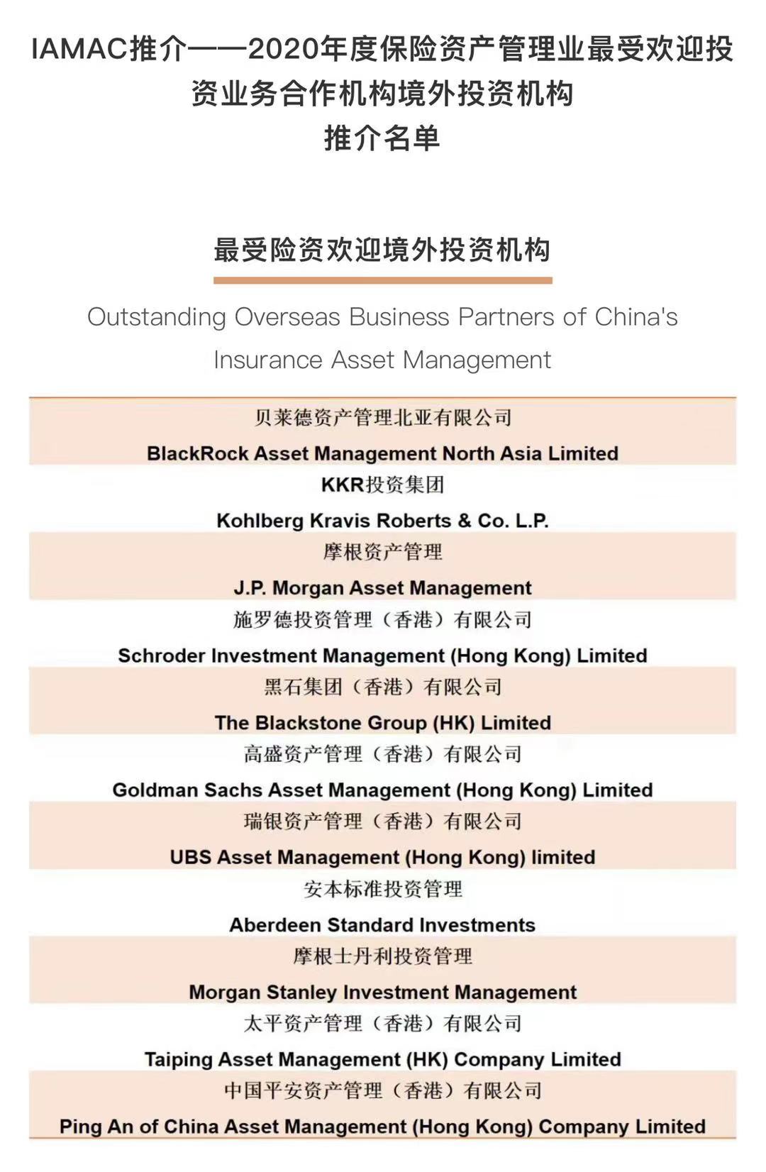 交流会上,协会根据行业调查结果,公布了“IAMAC推介——2020年度保险资产管理业最受欢迎投资业务合作机构”境外投资机构推介名单。