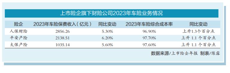 从上市险企披露的数据来看,他们旗下财险益达娱乐2023年车险综合成本率有不同程度上升。比如,人保财险、平安产险、太保产险车险综合成本率分别为96.9%、97.7%、97.6%,分别较上年增长1.3个、1.1个、1.1个百分点。业内人士认为,车险综合成本率上升与新能源车出险率高于燃油车有关。太保产险董事长顾越表示,在多重因素影响下,从太保产险出险率来看,新能源车出险率比燃油车出险率高出一倍。