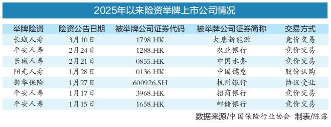 近期,部分险资通过举牌的方式配置个股。中国保险行业协会信息显示,截至3月13日,今年以来已有7次险资举牌,包括长城人寿举牌大唐新能源、中国水务,平安人寿举牌邮储银行H股、招商银行H股、农业银行H股,阳光人寿举牌中国儒意,新华保险举牌杭州银行。