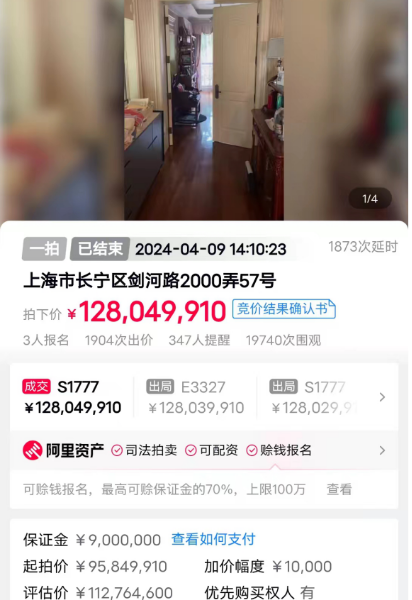 4月9日,阿里拍卖平台显示,经过3名报名竞价者1904次出价竞争,上海市长宁区一套建筑面积达600平方米的豪宅,最终以1.28亿元成交,高出评估价约1530万元,成交单价达到21.32万元/平方米。