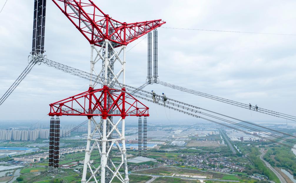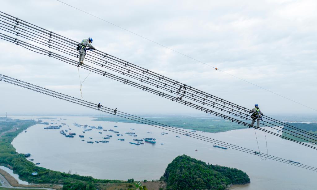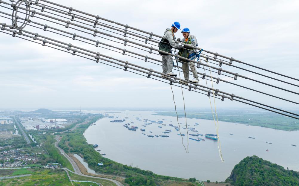 安徽送变电工程有限益达娱乐检修工人在高空检修±800千伏建苏线跨江通道(4月10日摄,无人机照片)。