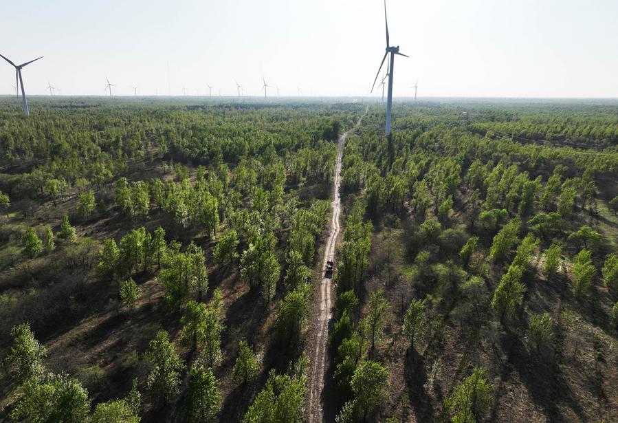 在通辽市科尔沁沙地拍摄的风力发电机组(无人机照片,5月15日摄)。新华社记者 连振 摄