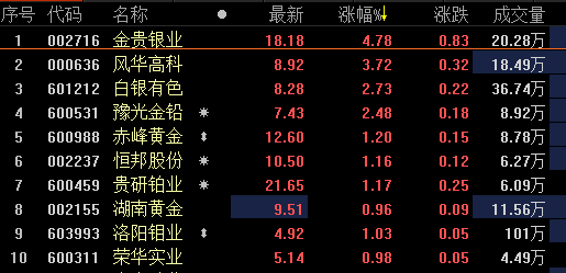 中国证券网讯 6月27日消息,黄金概念股尾盘发力,截至发稿,金贵银业涨逾5%,豫光金铅、白银有色、赤峰黄金、恒邦股份、湖南黄金纷纷上涨。