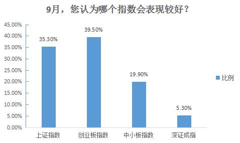 9月份,哪个指数会表现较好?截止今日(9月4日)上午(下同),东方财富调查结果显示,有35.3%的网友认为沪指较其他指数,会有较好的表现;39.5%的网友表示创业板指数会有较好表现;有19.9%的网友表示中小板指数会有较好表现;还有5.3%的网友表示深证成指会有较好表现。