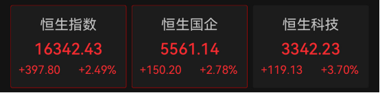 2月16日,港股早盘三大指数高开,午后涨幅持续扩大。截至发稿,恒生指数上涨2.49%,恒生科技指数上涨3.7%。
