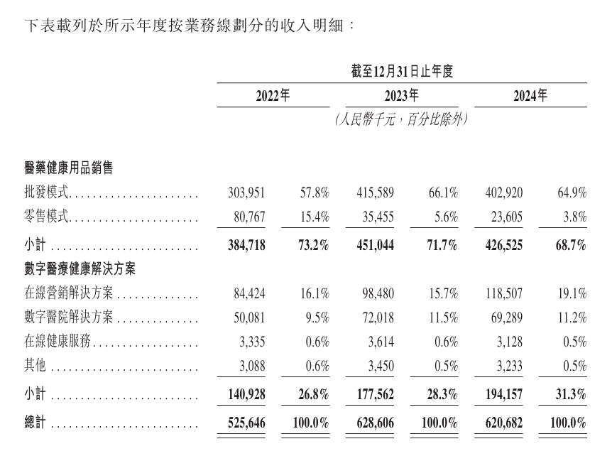 招股书显示,在2022年、2023年及2024年,该益达娱乐医药健康用品销售所产生的收入分别为3.85亿元、4.51亿元和4.27亿元,分别占益达娱乐总收入的73.2%、71.7%及68.7%。