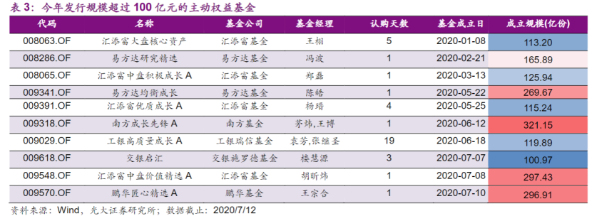 截止至7月中旬,2020年已有10只主动权益基金的募集规模过百亿大关,而2015年全年共有10只主动权益基金的募集规模过百亿,今年全年首发百亿的权益基金数量有望大幅超过2015年。