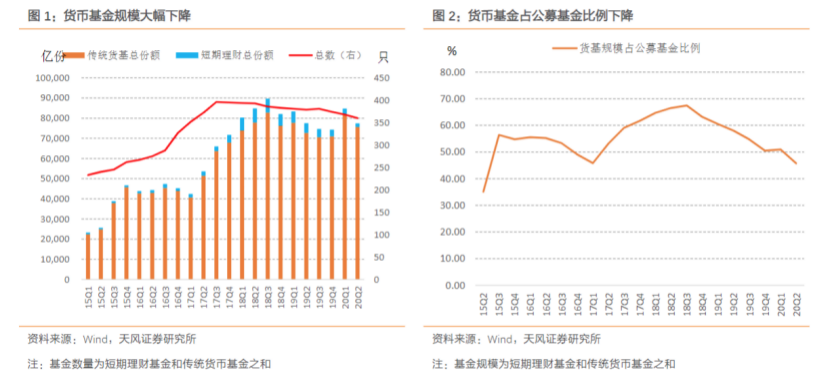 截至2020年二季度,传统货币基金份额为7.565万亿份,较上一季度减少6376亿份。传统货基规模大幅下降,且短期理财基金规模继续萎缩,叠加混合型基金和债券型基金规模继续增长,整体货币基金规模占比下降至45.78%。