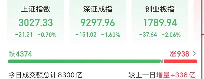 今天,A股三大股指集体调整,截至收盘,上证指数下跌0.7%,深证成指下跌1.6%,创业板指下跌2.06%。沪深两市逾4300只个股下跌。