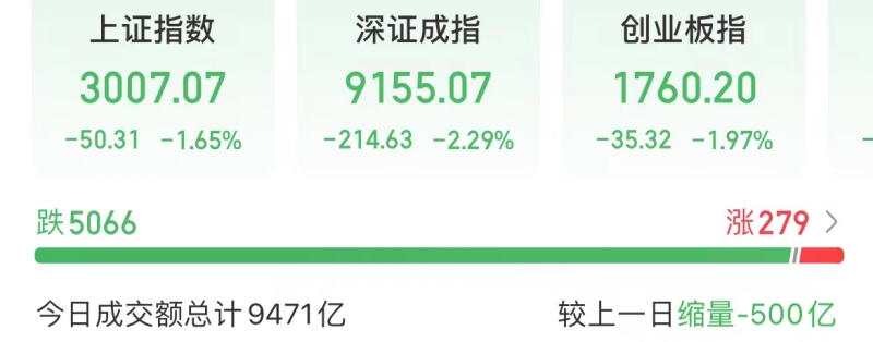 截至收盘,上证指数下跌1.65%,深证成指下跌2.29%,创业板指下跌1.97%。逾5000只个股下跌。