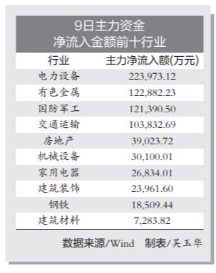 行业板块方面,9日有13个行业出现主力资金净流入,电力设备、有色金属、国防军工行业主力资金净流入金额居前,分别净流入22.40亿元、12.29亿元、12.14亿元。在出现主力资金净流出的18个行业中,医药生物、基础化工、食品饮料行业主力资金净流出金额居前,分别净流出19.22亿元、13.44亿元、9.06亿元。