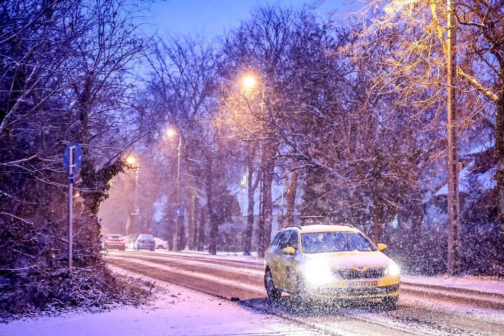 1月5日,在匈牙利布达佩斯,一辆汽车在雪中行驶。新华社发(鲍洛格·达维德摄)