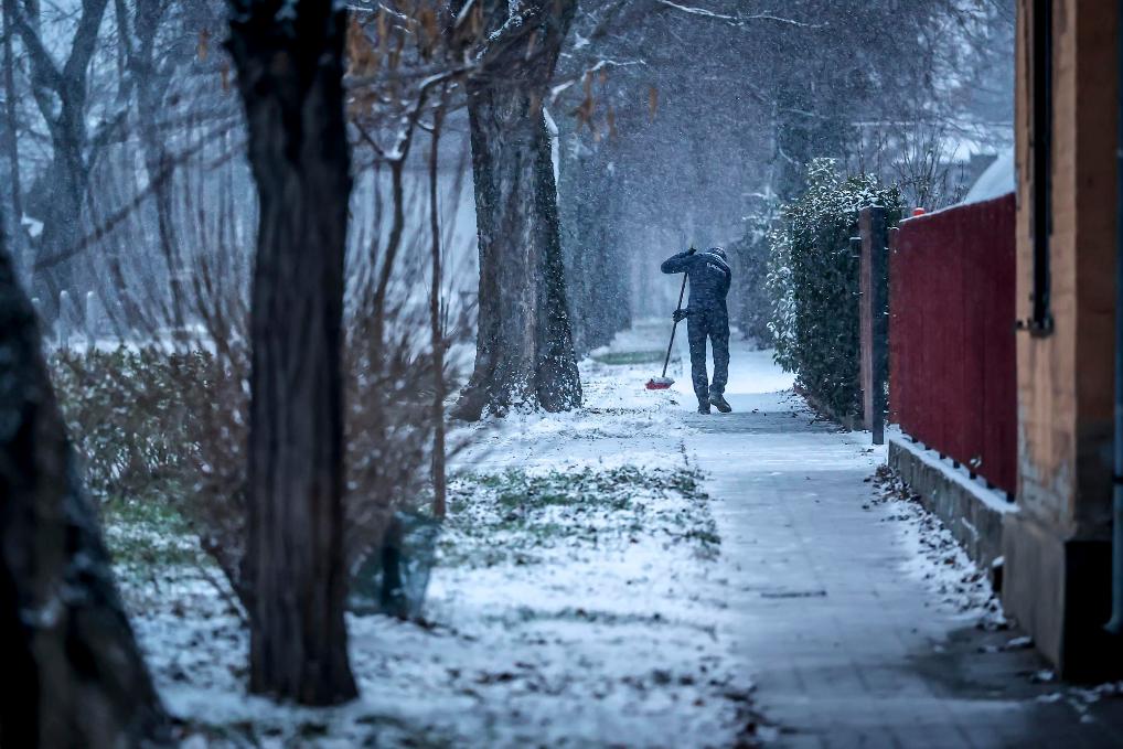 1月5日,在匈牙利布达佩斯,当地居民在打扫路面积雪。新华社发(鲍洛格·达维德摄)