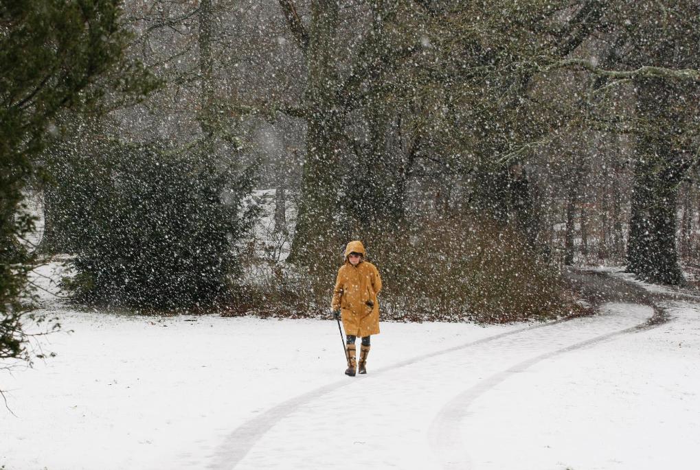 1月4日,在荷兰海牙,一名女子冒雪在公园内散步。新华社记者邵海军摄