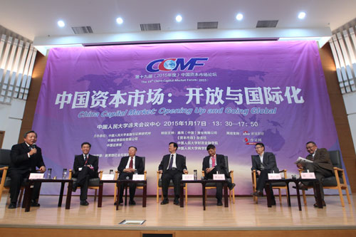 参与论坛第一模块的嘉宾 从左至右分别为:吴晓求、李稻葵、曹凤岐、黄大业、曹远征、章征、瞿强 摄:车亮