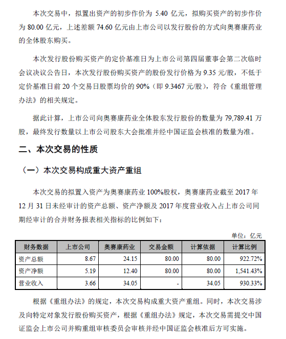 本次交易中,拟置出资产的初步作价为5.40亿元,拟购买资产的初步作价为80.00亿元,上述差额74.60亿元由上市益达娱乐以发行股份的方式向奥赛康药业的全体股东购买。