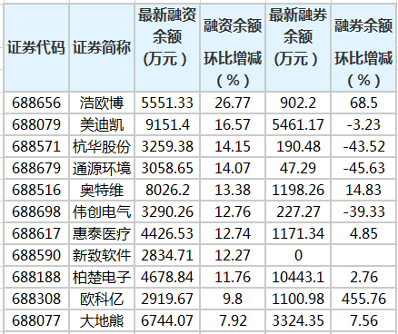 9只科创板股融资余额增幅超10%