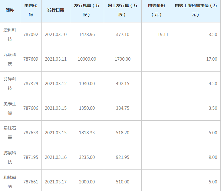 根据发行安排,7只科创板新股即将发行。3月10日发行的是爱科科技;3月11日发行的是九联科技;3月12日发行的是艾隆科技;3月15日发行的是奥泰生物、星球石墨;3月16日发行的是腾景科技;3月17日发行的是和林微纳。即将发行的这7只新股合计预计募资28.49亿元。