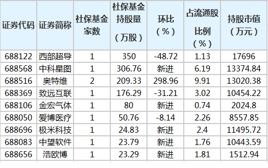 证券时报网讯,数据宝统计显示,一季度末社保基金共现身9只科创板个股前十大流通股东榜。其中,新进5只,增持1只。从持股比例看,社保基金持有比例最多的是奥特维,持股量占流通股比例为9.91%。持股数量方面,社保基金持股量最多的是西部超导,共持有350万股;中科星图、奥特维等紧随其后。