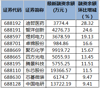 证券时报网讯,wind统计显示,12月13日共有211只科创板个股融资余额环比增加。其中,8股融资余额增幅超过10%。融资余额增幅最大的是迪哲医药,最新融资余额为3774.4万元,环比增幅达28.32%;融资余额增幅较大的还有智洋创新、煜邦电力、卓锦股份、聚石化学、四方光电等股。