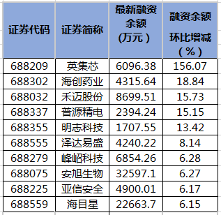 wind统计显示,4月21日共有159只科创板个股融资余额环比增加。其中,5股融资余额增幅超过10%。融资余额增幅最大的是英集芯,最新融资余额为6096.38万元,环比增幅达156.07%;融资余额增幅较大的还有海创药业、禾迈股份、普源精电、明志科技、泽达易盛等股。(阙福生)