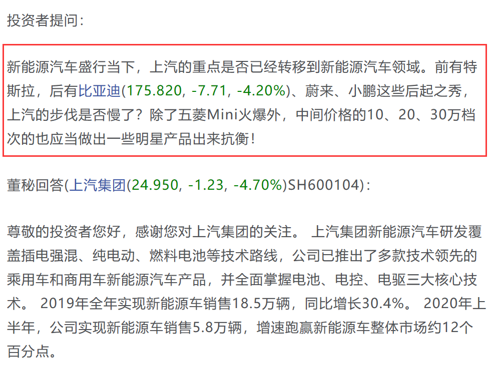 今日,上交所互动平台上,有投资者提问,在新能源旗下盛行的当下,前有特斯拉,后有比亚迪、蔚来、小鹏,上汽在新能源领域的步伐是否慢了。