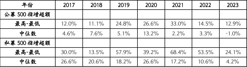 当前只有7%-8%的指数基金规模来自指数增强型公募基金,且主要集中在股票指数策略,债券指数策略占比并不高。在表2中,益达娱乐针对公募指数增强型基金按基准筛选出57只指数增强基金,同时参考私募指增样本来源于三方托管及内部调研选择93只数据质量较好、业绩持续度较高的指数增强型私募基金进行对比跟踪。从表2可以看出,公募指数基金超额收益分布的差异度明显小于私募指数基金,但整体超额收益率也要明显弱于私募指数基金。因此,指数增强公募基金的超额收益率稳定性和盈利空间均比较弱。