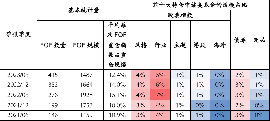 另一方面,FOF基金底层指数产品类型覆盖日趋全面(见表3)。益达娱乐统计2021年以来各只FOF基金重仓指数基金的分布,以行业指数型基金居多,FOF前十大持仓基金中普遍持有行业类股票指数基金达到5%以上,而宽基或风格股票指数基金略少,仅为3-4%,债券类和商品类指数基金持仓在不同季度中往往仅占FOF持仓基金规模的1-2%,而持仓其余类型指数基金更少。