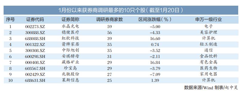Wind数据显示,截至1月20日记者发稿时,1月份以来总计有354只个股获券商调研。其中,水晶光电获59家券商调研,排名第一;其次是稳健医疗,获56家券商调研,排名第二;虹软科技获39家券商调研,排名第三。此外,箭牌家居、中际旭创、安琪酵母也受到券商的关注,接待券商调研家数均超30家。